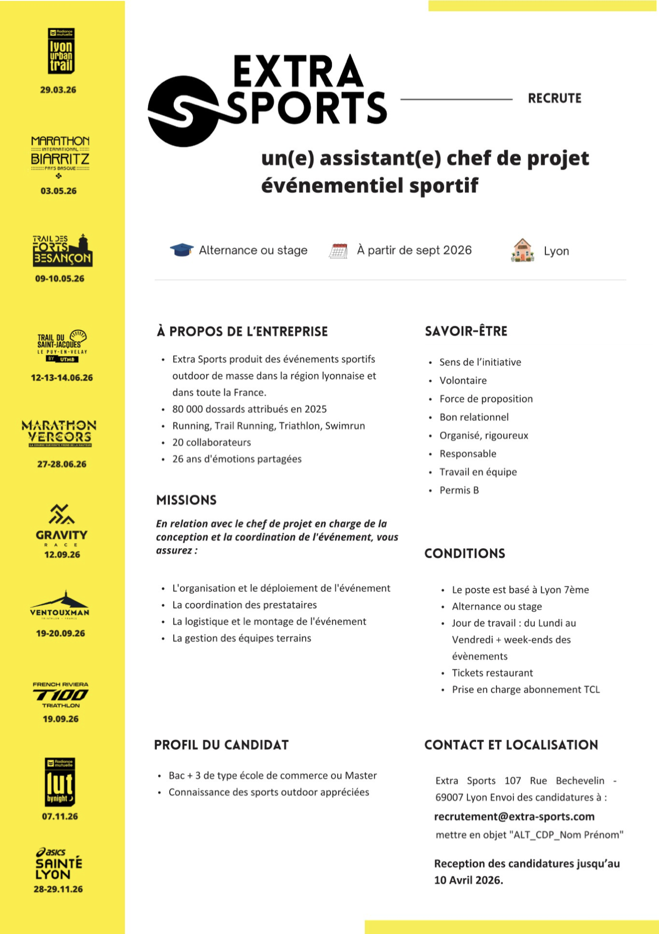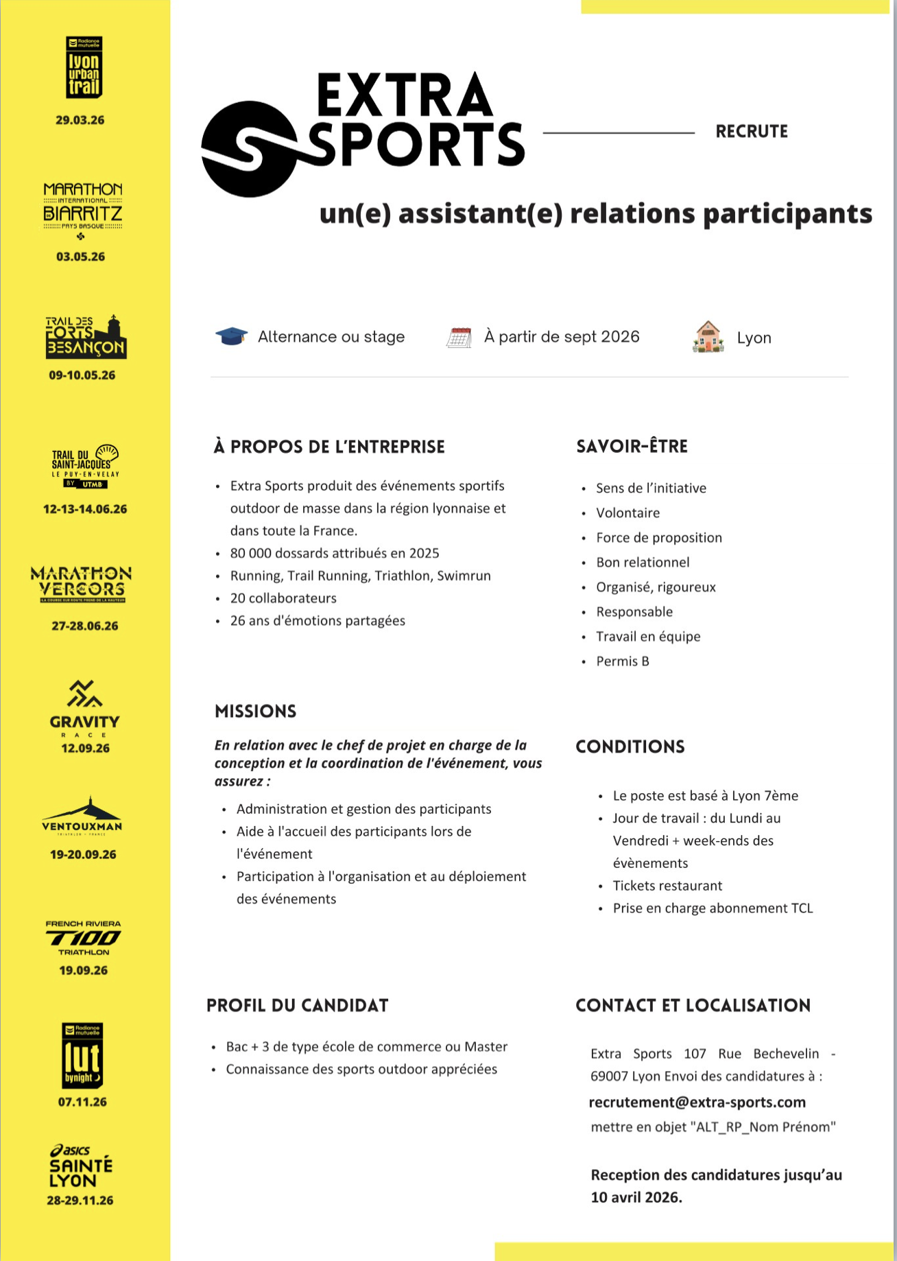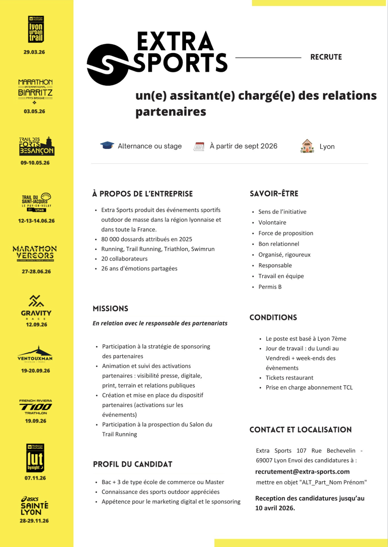 RECRUTEMENT Nous avons 3 offres de stages/ alternances à promouvoir pour septembre 2026 : Pour postuler :Mettre en objet “ALT_(en fonction du post : Part ou CDP ou RP)_Nom Prénom”Adresse mail : contact@extra-sports.com👉 Réception des candidatures jusqu’au 10 Avril 2026